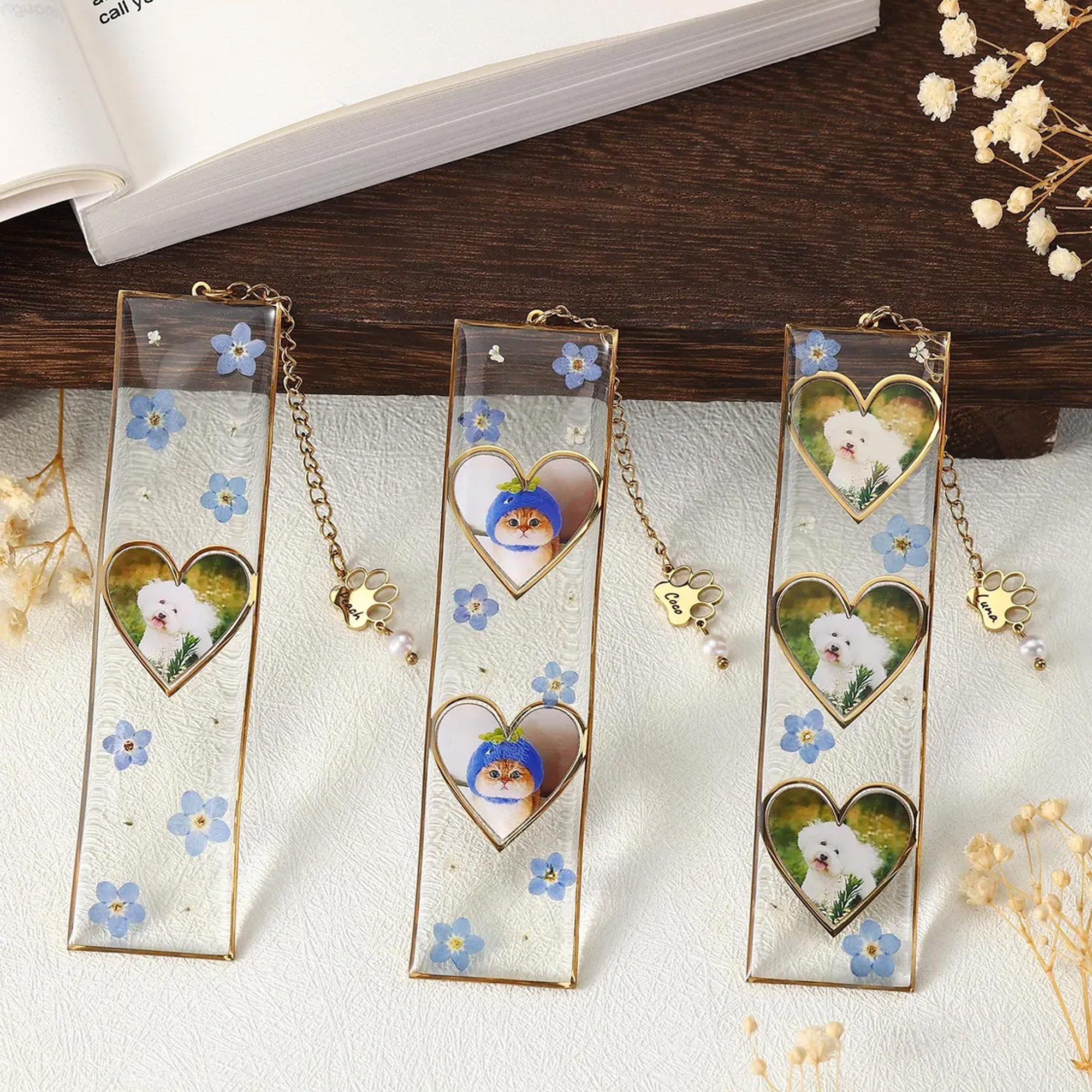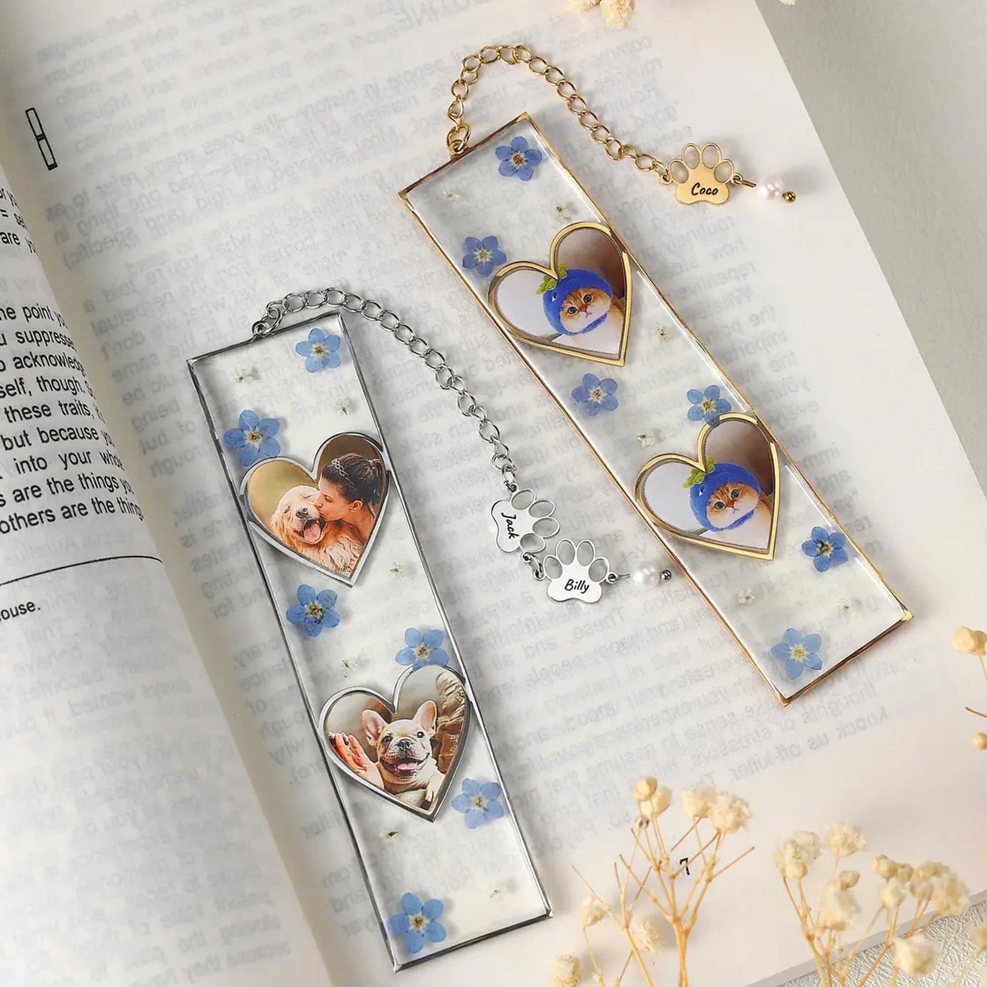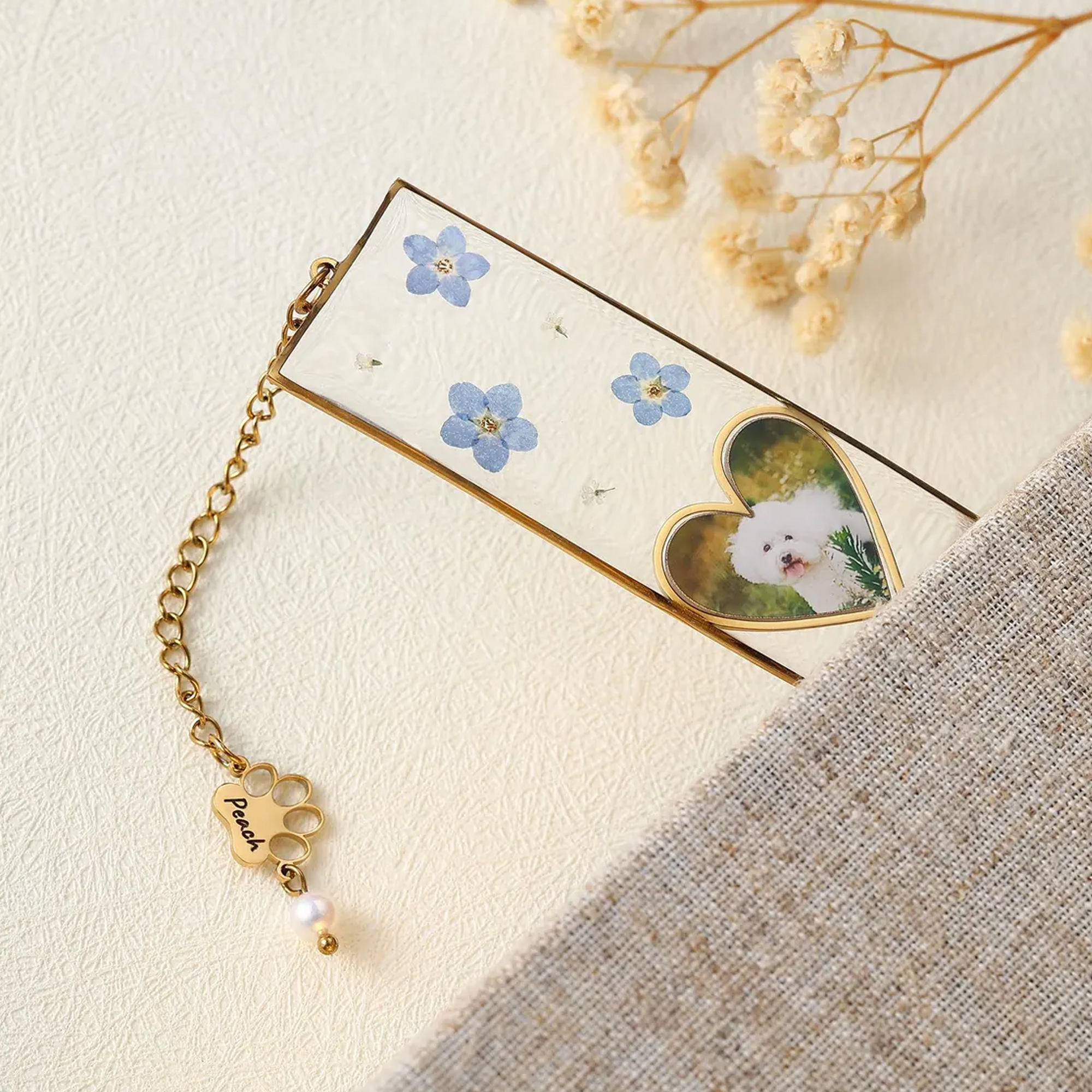 Heartfelt Pet Tribute – This elegant bookmark features real pressed flowers encased in clear resin, creating a delicate and lasting floral backdrop. Up to three heart-shaped photos of your beloved pet can be included, capturing cherished memories in a beautiful, wearable keepsake.