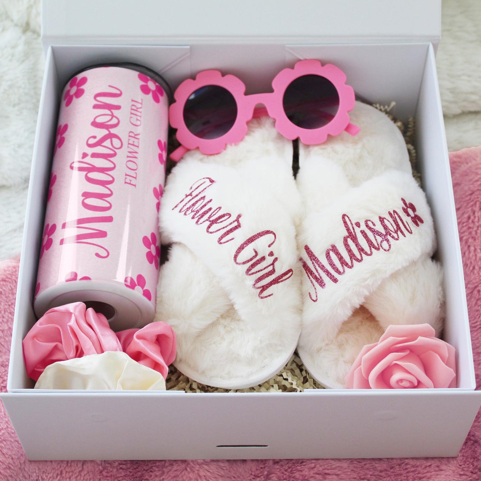 Charming Items -  This flower girl proposal gift box includes a customized tumbler, slippers, sunglasses, and two scrunchies, all packaged in a delightful gift box. This gift set is perfect for those looking for flower girl proposal box ideas or a unique gift for the bride. It's sure to propose both memorable and heartfelt.